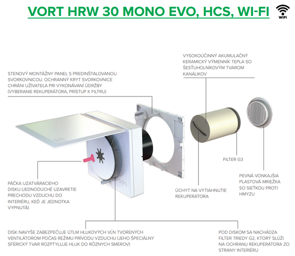 VORT HRW 30 MONO EVO HCS obsahuje filtr G2 pro interiérovou stranu, kvalitní keramický výměník s kanálky šestiúhelníkového tvaru pro maximální efektivitu a G3 filtrem pro exteriérovou stranu, vnější plastovou mřížku se síťkou proti hmyzu. Manuální ovládání. Beznapěťový kontakt pro vzdálenou aktivaci BOOST režimu. Svorky pro připojení jednotek (pomocí RS485 komunikace) a synchronizace provozu.