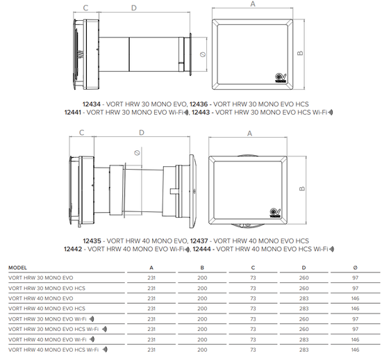 Decentrální rekuperační jednotka VORT HRW 30 MONO EVO HCS je vylepšenou verzí původních jednotek VORT HRW MONO. Vysoce účinná (90% účinnost rekuperace) a úsporná jednotka s EC motorem, dálkovým ovládáním a zabudovanými snímači vlhkosti, teploty a okolního světla určena pro větrání a rekuperaci tepla v bytech, rodinných domech a kancelářích. Určena pro otvor o průměru 100 mm.