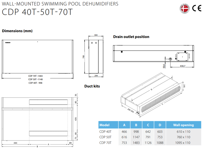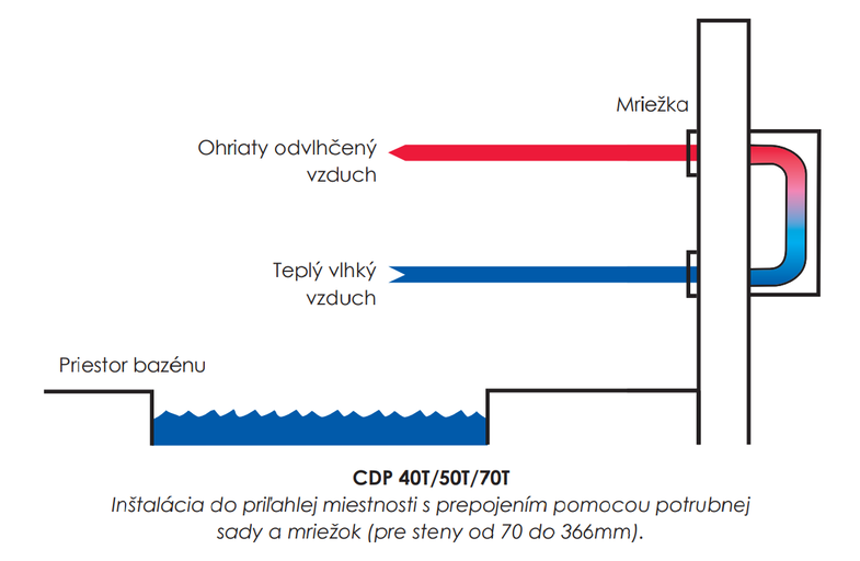Odvlhčovač Dantherm CDP 70 T je nástěnný bazénový odvlhčovač vhodný pro domácí bazény a menší wellness centra. Tento model se montuje do místnosti přímo sousedící s bazénem s použitím potrubní propojovací soupravy. Tak aby odvlhčovač spolehlivě plnil svou funkci, instalace je vhodná pro prostory s vodní plochou bazénu o 40m2.