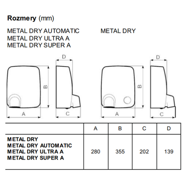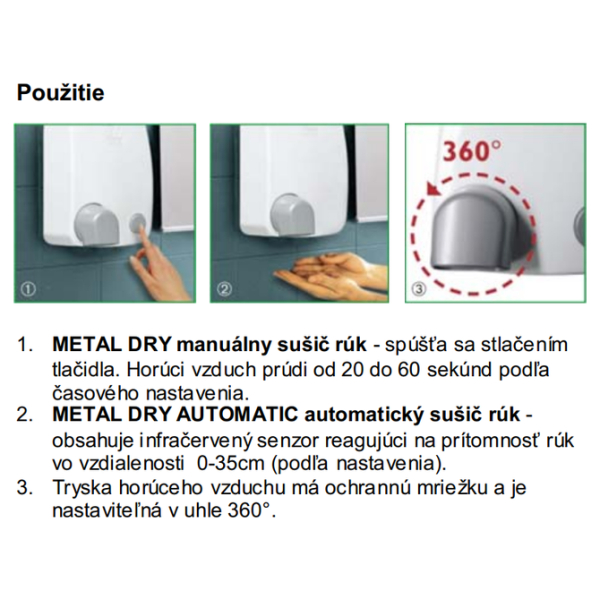 Manuální osoušeč rukou Vortice Metal Dry je vhodný pro domácnosti, nákupní centra, restaurace, komerční prostory a další veřejné prostory. Proudění horkého vzduchu je možné nastavit od 20 do 60 sekund. Tryska horkého vzduchu má ochrannou mřížku a je nastavitelná v úhlu 360°. Přední kryt vyrobený z hliníku odlévaného pod tlakem je natřený barvou odolnou vůči grafitům a má zámek odolný vůči vandalům. Balení obsahuje montážní klíč pro speciální šrouby. Zařízení nemusí být uzemněné, má dvojitou izolaci. Ventilátor osoušeče má indukční motor s tepelnou pojistkou a bezpečnostním termostatem, který odpojuje zařízení při přehřátí.