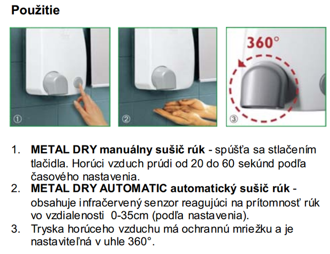 Automatický osoušeč rukou Vortice Metal Dry je vhodný pro domácnosti, nákupní centra, restaurace, komerční prostory a další veřejné prostory. Proudění horkého vzduchu je možné nastavit od 20 do 60 sekund. Automatická verze se spouští pohybem ruky ve vzdálenosti 0-35 cm (dle nastavení). Tryska horkého vzduchu má ochrannou mřížku a je nastavitelná v úhlu 360°. Přední kryt vyrobený z hliníku odlévaného pod tlakem je natřený barvou odolnou vůči grafitům a má zámek odolný vůči vandalům. Balení obsahuje montážní klíč pro speciální šrouby. Zařízení nemusí být uzemněné, má dvojitou izolaci. Ventilátor osoušeče má indukční motor s tepelnou pojistkou a bezpečnostním termostatem, který odpojuje zařízení při přehřátí.