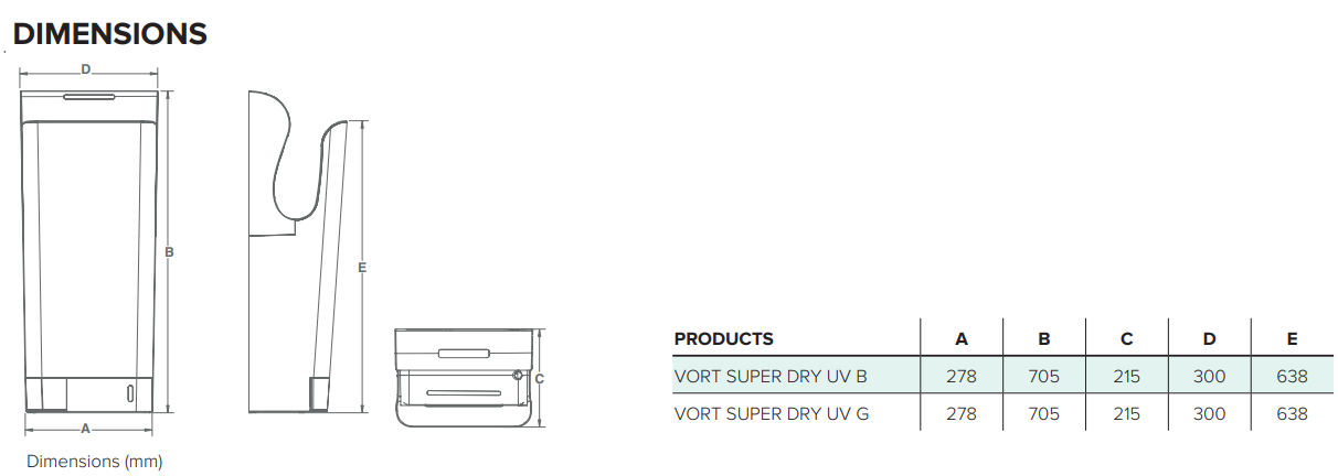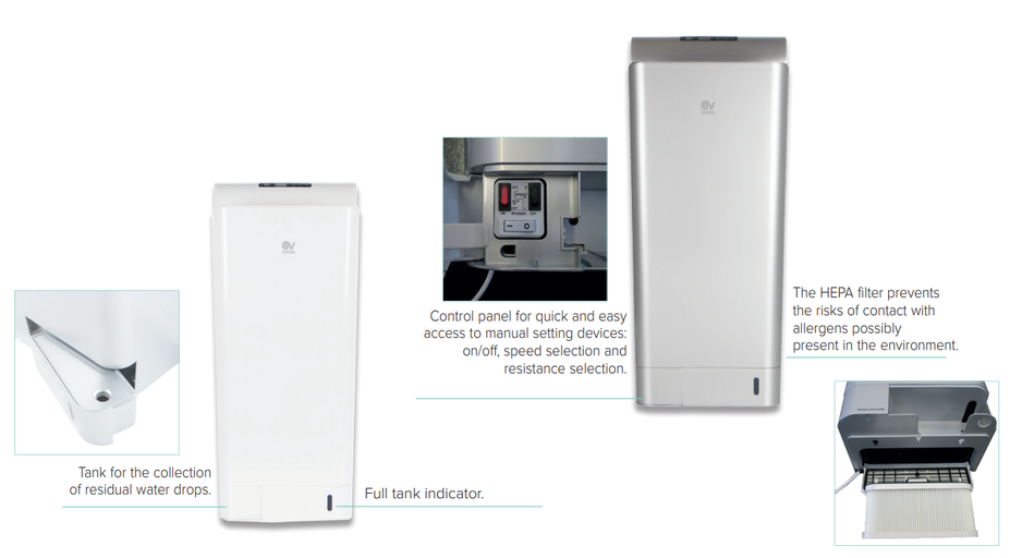 Plně automatický vysoce výkonný tryskový osoušeč rukou Vortice Vort Super Dry UV G je navržen speciálně pro frekventovaný provoz. Obsahuje výkonný radiální ventilátor pro rychlé sušení.