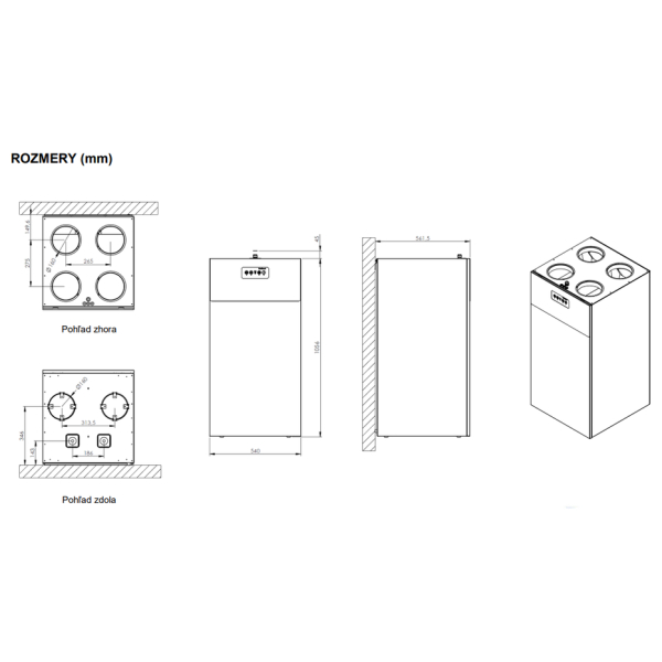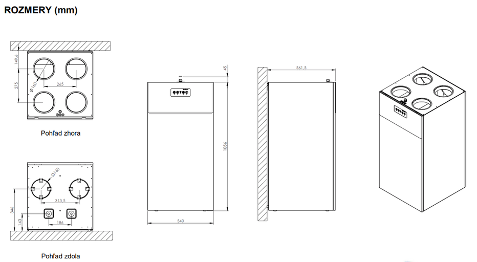 • Připojení potrubí – 4x Ø160mm shora + 2x Ø160mm zdola