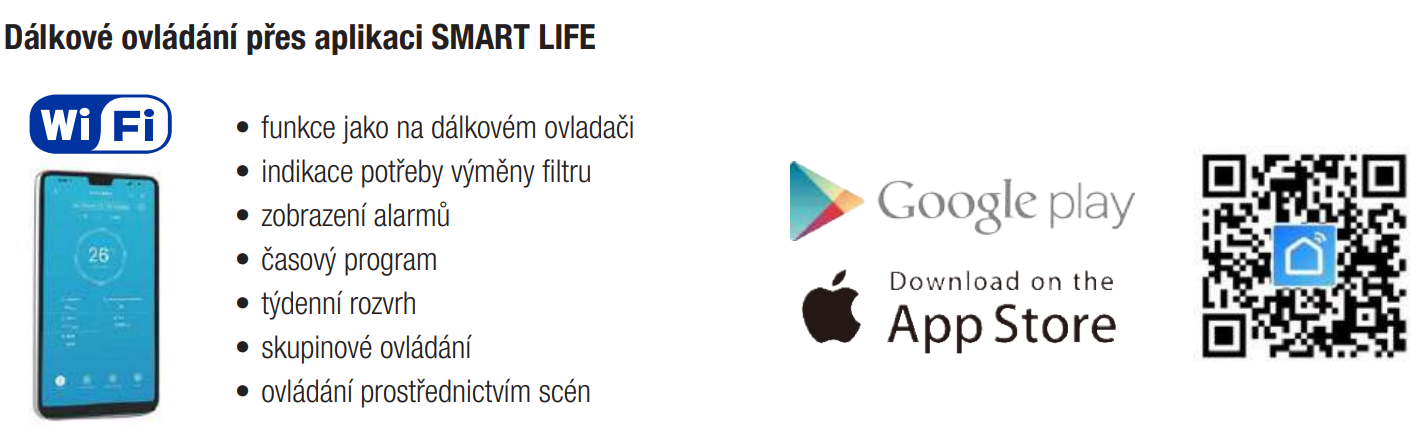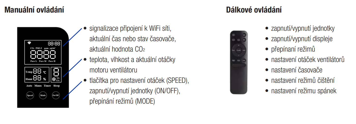 - Různé funkce – auto, manual, časovač, spánek, čištění (režimy PURE)