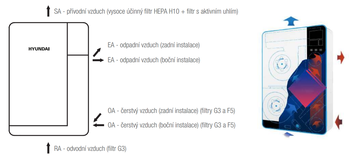 - Předfiltry G3 (RA, OA) a střední filtr F5 (OA)