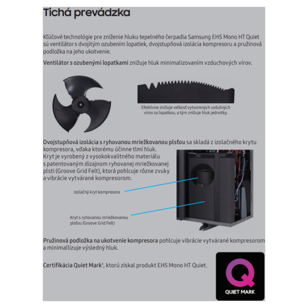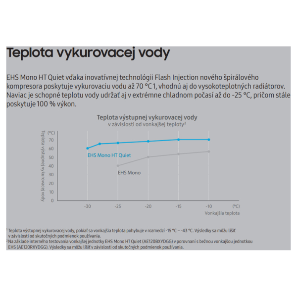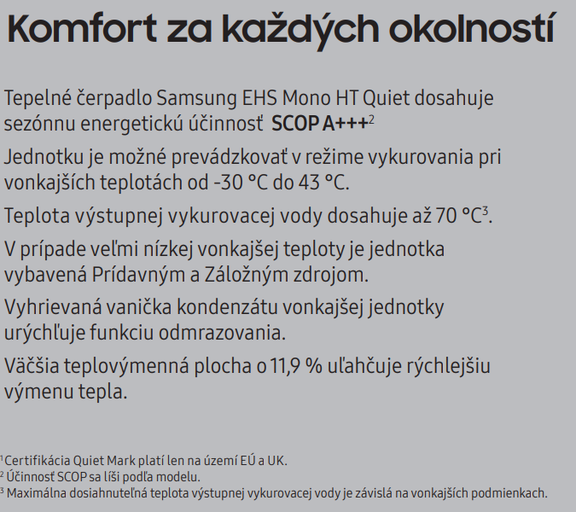 Samsung EHS ClimateHub Mono HT Quiet je tepelné čerpadlo vzduch-voda s vysokou teplotou topné vody (až 70°C) a nízkou hlučností (od 35 dB(A)). Toto split ALL IN ONE provedení (se zásobníkem na TUV 200 l) je vhodné jak pro renovace domů, tak i pro nové objekty. Jedná se o prvotřídní systém vytápění, který lze jednoduše a elegantně integrovat k různým venkovním fasádám. S ohledem na využití malého množství chladiva R32 se zmírňují negativní dopady na globální oteplování. Tepelné čerpadlo lze navíc dálkově ovládat aplikací SmartThings.