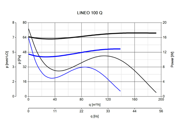 Dvouotáčkový potrubní ventilátor řady Lineo Q je vybaven AC motorem s 2stupňovou regulací otáček a kuličkovými ložisky. Typ T s časovým doběhem. Určen pro připojení potrubí ø 100mm. Díky svým vlastnostem a konstrukci je vhodný pro delší vzduchotechnické potrubí. Krytí IP44 zajišťuje ochranu proti prachu a stříkající vodě ze všech stran. Oběžné kolo ventilátoru je vyváženo přímo na motoru.