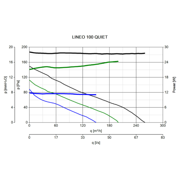Tříotáčkový potrubní ventilátor řady Lineo je vybaven AC motorem s 3stupňovou regulací otáček a kuličkovými ložisky. Určen pro připojení potrubí ø 100mm. Díky svým vlastnostem a konstrukci je vhodný pro delší vzduchotechnické potrubí. Krytí IP45 zajišťuje ochranu proti prachu a stříkající vodě ze všech stran. Oběžné kolo ventilátoru je vyváženo přímo na motoru.