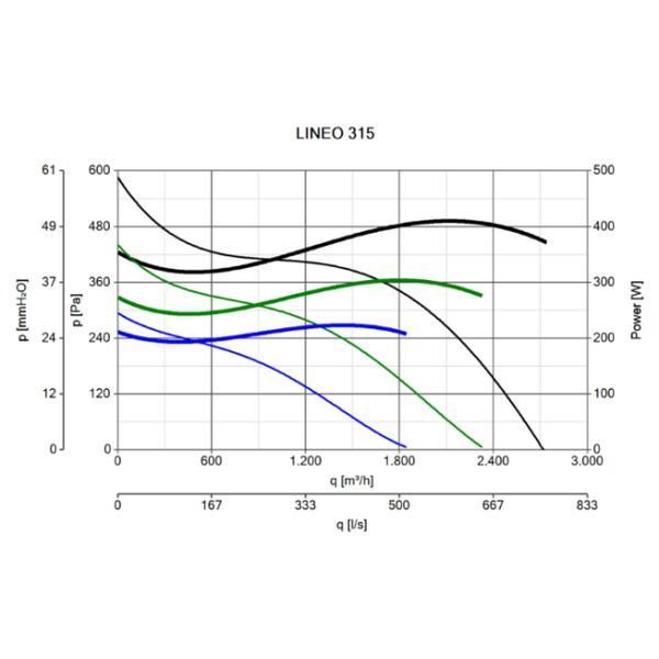 Tříotáčkový potrubní ventilátor řady Lineo je vybaven AC motorem s 3stupňovou regulací otáček a kuličkovými ložisky. Určen pro připojení potrubí ø 315mm. Díky svým vlastnostem a konstrukci je vhodný pro delší vzduchotechnické potrubí s vysokou vlhkostí – krytí IPX5. Oběžné kolo ventilátoru je vyváženo přímo na motoru.