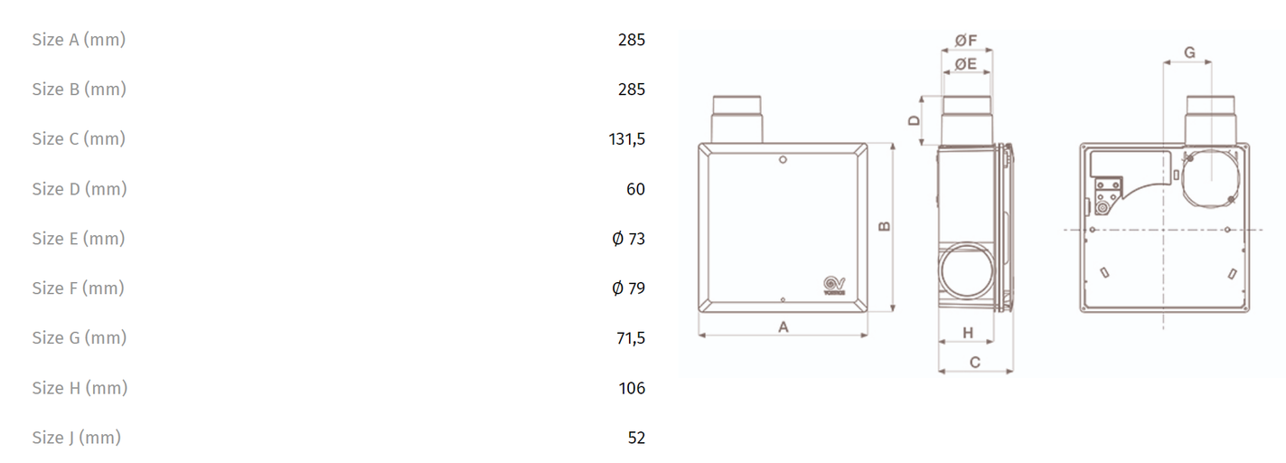 Vortice krabice QE-B I K90 S 2R – jako QE-B I K90 S + obsahuje doplňkové nerezové hrdlo na pravé straně pro odsávání z druhé místnosti