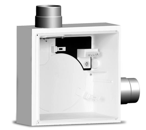 Krabice pro zapuštěnou montáž s požární úpravou K90, s požární zpětnou klapkou K90 a bočním výfukem. Obsahuje doplňkové nerezové hrdlo na pravé straně pro odsávání z druhé místnosti.