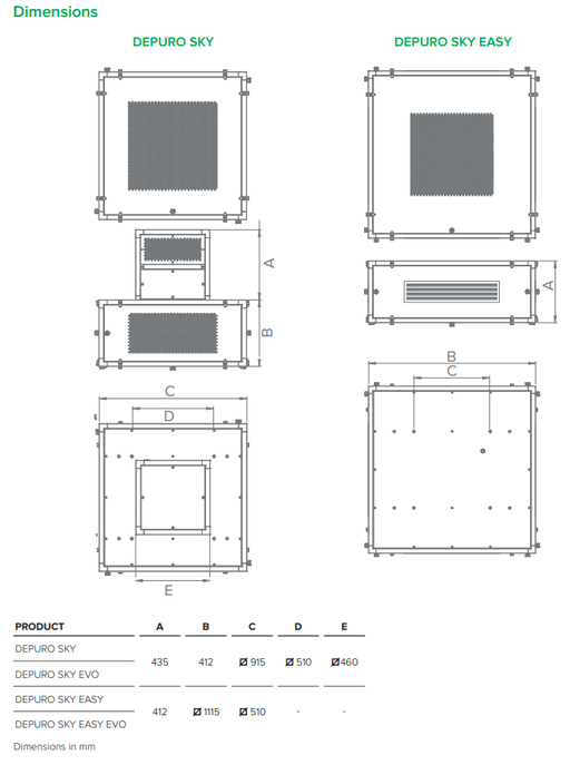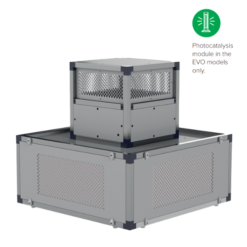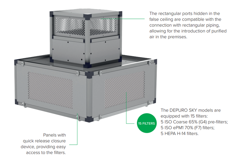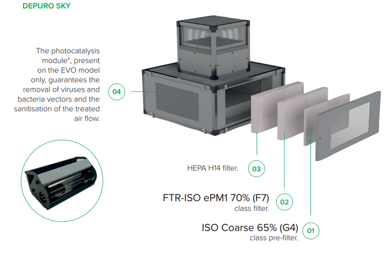 Vysoce účinné čističe vzduchu Vortice Depuro Sky Evo jsou určeny pro skrytou instalaci do stropu (podhledu) v komerčních a průmyslových objektech o ploše až 330 m2. Jsou vysoce výkonné, jednoduché pro instalaci a údržbu a tiché díky zvukotěsným panelům. Díky komplexnímu filtračnímu systému dokáží rychle odstranit koncentrace znečišťujících látek, alergenů a patogenů přítomných ve vzduchu, čímž zajišťují bezpečnost a pohodlí obyvatel. Efektivní ochrana i proti viru COVID-19 díky fotokatalytickému modulu. Základem čistícího a dezinfekčního procesu je silně oxidační účinek volných radikálů OH*, které se uvolňují při ozařování katalyzátoru (na bázi oxidu titaničitého (TiO2)) světlem přiměřené vlnové délky (UV-C lampa). Látky znečišťující ovzduší jako oxid uhličitý (CO2), oxidy síry (SOx), oxidy dusíku (NOx), oxid uhelnatý (CO) a polycyklické aromatické uhlovodíky (PAH) se pomocí volných radikálů OH* transformují na sloučeniny toxicity (například oxid dusnatý (NO) a oxid dusičitý (NO2) se transformují na dusičnan (xNO3)). Podobně v případě těkavých organických sloučenin (VOC), jako formaldehyd a aceton, které patří mezi hlavní příčiny nepříjemného zápachu v uzavřeném prostoru, dochází k jejich rozkladu a transformaci na neškodné látky jako oxid uhličitý (CO2) a voda.