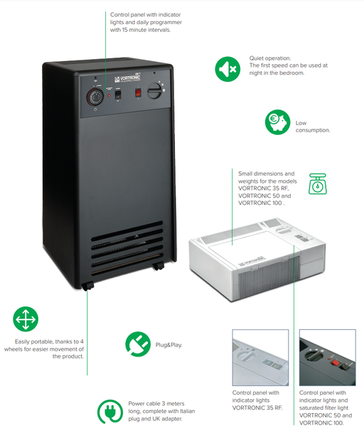Čistič vzduchu Vortice Vortronic vhodný do malých aj veľkých miestností čistí vzduch od tabakového dymu, prachu a nečistôt. Trojotáčkový motor s možnosťou regulácie otáčok. Obsahuje elektrostatický filter so silným čistiacim účinkom, ktorý priťahuje častice nečistôt.