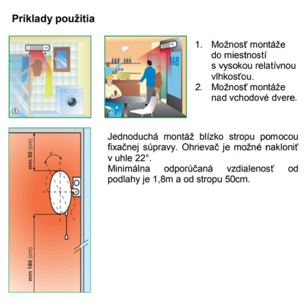 - Minimálna odporúčaná vzdialenosť od podlahy je 1,8m a od stropu 50cm.