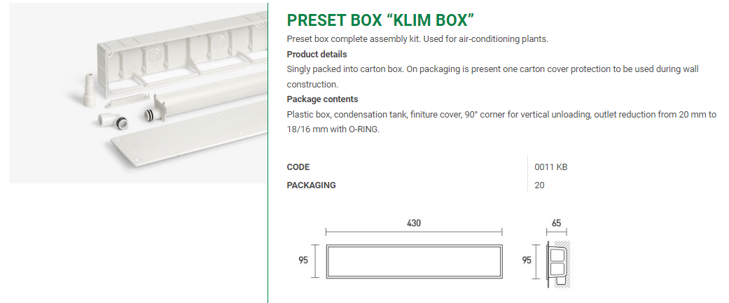 Podomietkový box Klimbox s miestom pre medené potrubie a kábel a so samostatnou oddelenou časťou pre odvod kondenzátu.