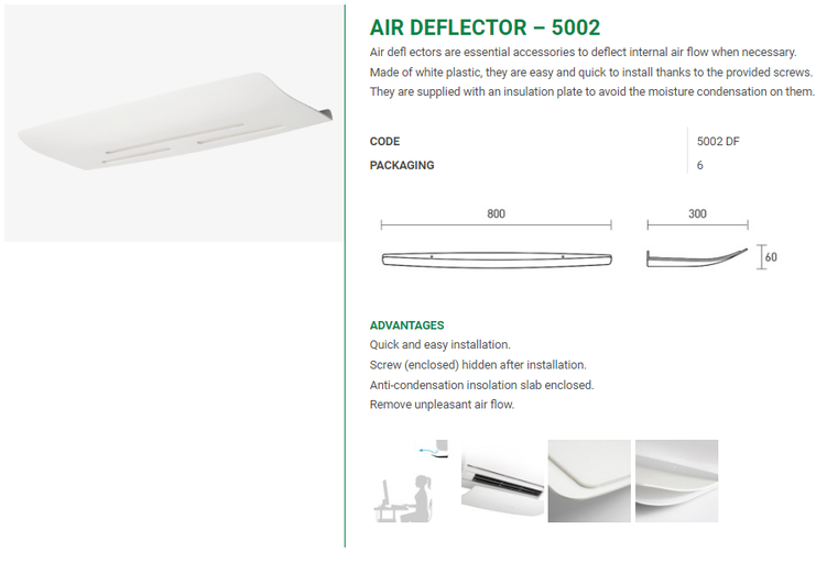 Usmernenie vyfukovaného vzduchu z klimatizácie, aby nedochádzalo k priamemu ofuku osôb. Model s tepelnou izoláciou (proti tvorbe kondenzátu). Skrutky na upevnenie sú súčasťou dodávky. Usmerňovač vzduchu pre nástenné klimatizácie so šírkou výfuku do 800mm.