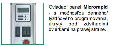 - Ovládací panel s možnosťou denného/ týždňového programovania, ukrytý pod zdvíhacími dvierkami na pravej strane.