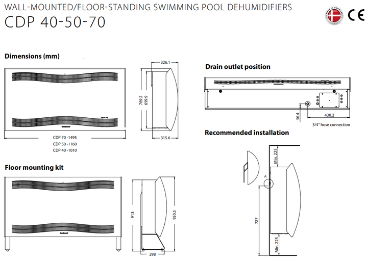 Odvlhčovač Dantherm CDP 40 je nástenný bazénový odvlhčovač vhodný pre domáce bazény a menšie wellness centrá. Tento model je určený na inštaláciu priamo do odvlhčovaného priestoru. Tak aby odvlhčovač spoľahlivo plnil svoju funkciu, inštalácia je vhodná pre priestory s vodnou plochou bazéna o 20m2.