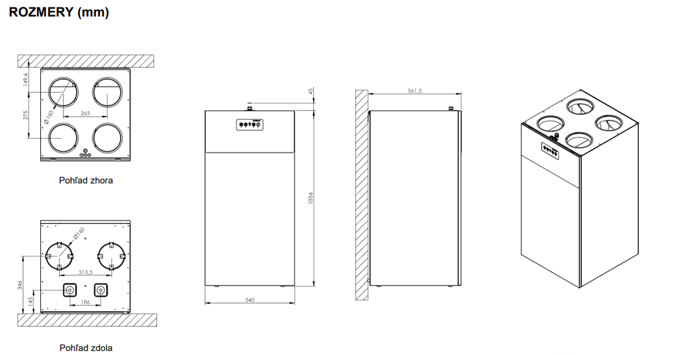 - Pripojenie potrubia – 4x Ø160mm zhora + 2x Ø160mm zdola