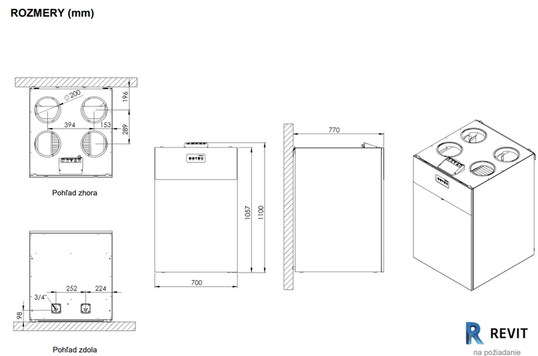 - Pripojenie potrubia – 4x Ø200mm zhora