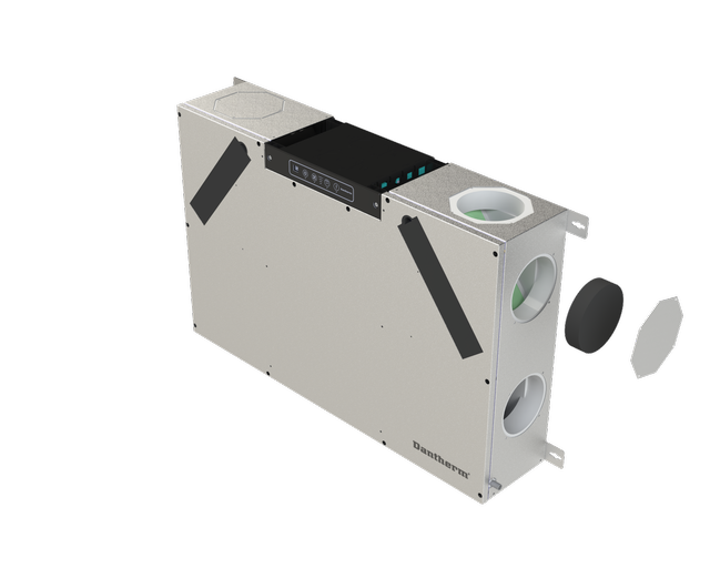 Centrálna rekuperačná jednotka Dantherm RCC 220 P2 je jedinečné a flexibilné riešenie vetrania obytných priestorov. S výškou iba 20 cm je ideálna pre inštaláciu do stropných podhľadov alebo na stenu, dokonca aj skrytú v skrini. Jednotka je elektronicky reverzibilná. To umožňuje namontovať rovnaký typ jednotky s vnútorným/vonkajším potrubím pripojeným na pravú alebo ľavú stranu jednotky. Elektrické prípojky je možné pripojiť zľava alebo sprava. Základná jednotka sa dodáva so zabudovaným ovládacím panelom.