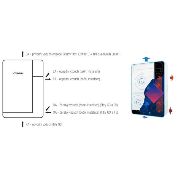 Decentrálna nástenná rekuperačná jednotka Hyundai HRS-WM v sebe spája funkciu vetrania s rekuperáciou energie a čistením vzduchu. S ohľadom na jej vzduchový výkon 150m3/h je vhodná pre miestnosti s plochou 20-45m2. Jednotka je navrhnutá na prevádzku v miernom pretlaku. V režime manual je možné jednotky nastaviť aj na prevádzku v rovnotlaku.