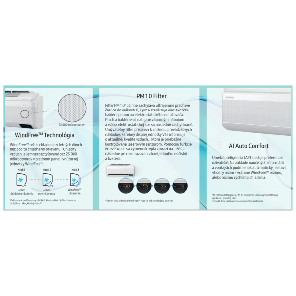 Samsung WindFreeTM Pure 1.0 je prémiová nástenná split klimatizácia vhodná predovšetkým na rezidenčné účely. Dokáže nielen chladiť, ale aj účinne kúriť. Séria Pure 1.0 je schopná vďaka svojim pokročilým funkciám uspokojiť aj tých najnáročnejších užívateľov. Klimatizácia vďaka technológii WindFreeTM udržuje príjemné chladné prostredie bez akéhokoľvek prievanu chladného vzduchu. Vďaka inteligentným ovládacím prvkom sa prispôsobuje osobným preferenciám používateľa a vytvára tak komfortné prostredie, ktoré automaticky udržuje. Jednotky s moderným bielym dizajnom ponúkajú energetickú účinnosť A++ v režime chladenia aj vykurovania. Užíva sa ekologické chladivo R32.