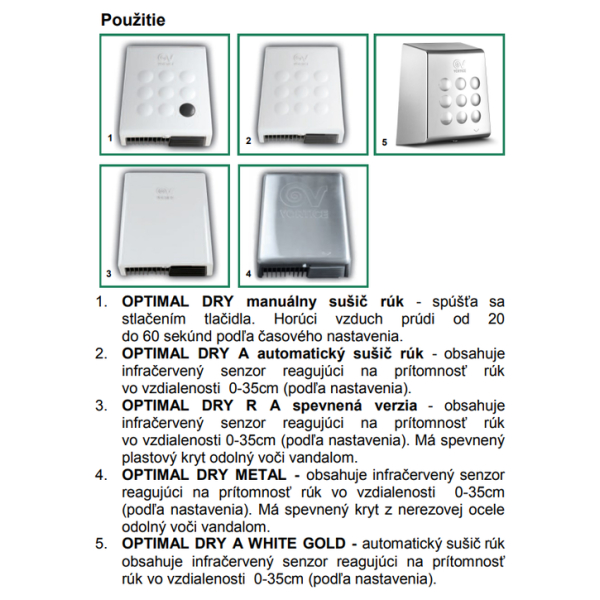 Automatický sušič rúk Vortice Optimal Dry RA je vhodný pre domácnosti, nákupné centrá, reštaurácie, komerčné priestory a ďalšie verejné priestory. Spevnená verzia krytu R je v prevedení Antivandal – zabezpečenie proti poškodeniu a demontáži. Automatická verzia sa spúšťa pohybom ruky vo vzdialenosti 0-35 cm (podľa nastavenia). Prúdenie horúceho vzduchu je možné nastaviť od 20 do 60 sekúnd. Sušič Optimal Dry zaistí jednoduchú montáž na stenu pomocou troch skrutiek. Balenie obsahuje montážny kľúč pre skrutky a otvorenie krytu. Ventilátor sušiča má indukčný motor s tepelnou poistkou a bezpečnostným termostatom, ktorý odpája zariadenie pri prehriatí.