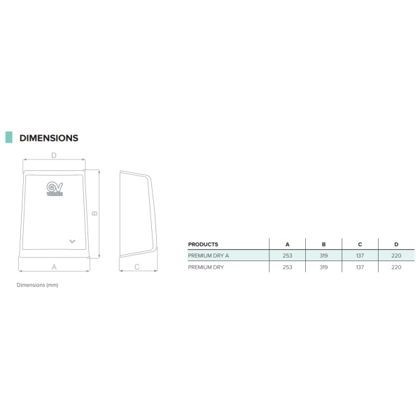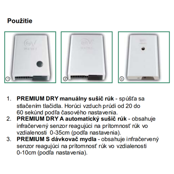 Manuálny sušič rúk Vortice Premium Dry je vhodný pre domácnosti, nákupné centrá, reštaurácie, komerčné priestory a ďalšie verejné priestory. Manuálna verzia sa spúšťa stlačením tlačidla. Prúdenie horúceho vzduchu je možné nastaviť od 20 do 60 sekúnd. Sušič Premium Dry je opatrený spevneným krytom a Antivandal ochranou, ktorá vďaka špeciálnym skrutkám zabraňuje otvoreniu prístroja a jeho poškodeniu. Ventilátor sušiča má indukčný motor s tepelnou poistkou a bezpečnostným termostatom, ktorý odpája zariadenie pri prehriatí.