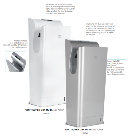 Plne automatický vysokovýkonný tryskový sušič rúk Vortice Vort Super Dry UV G je navrhnutý špeciálne pre frekventovanú prevádzku. Obsahuje výkonný radiálny ventilátor pre rýchle sušenie.