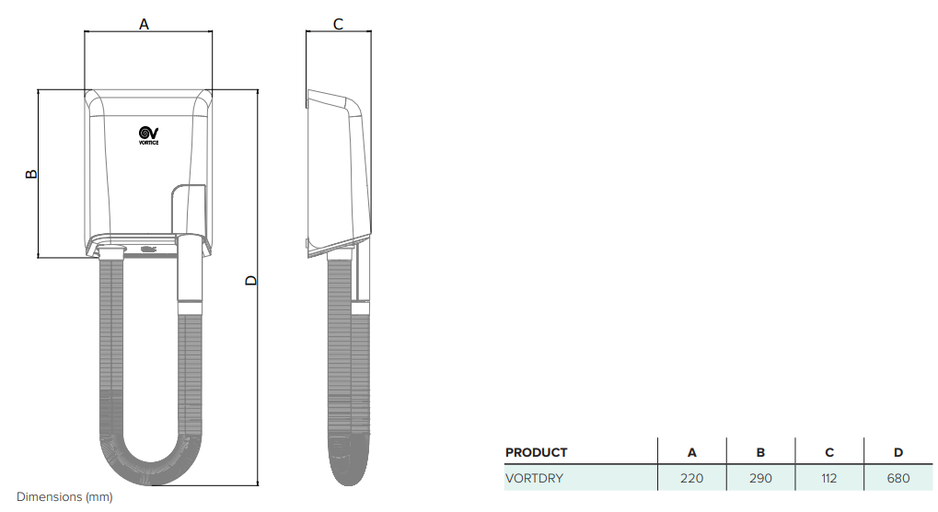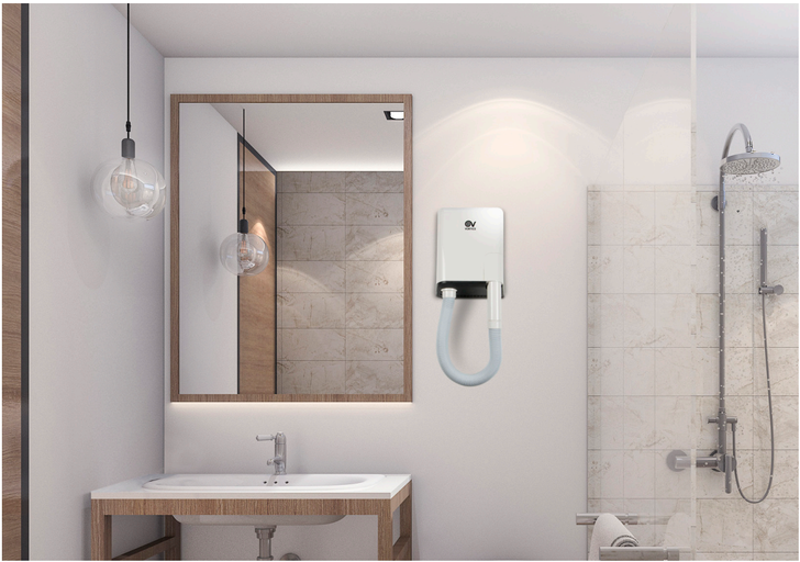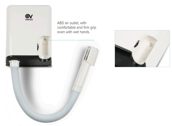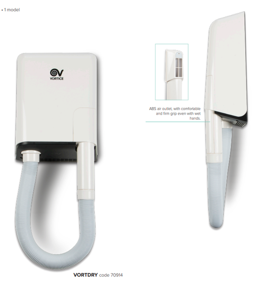 Nástenný automatický sušič vlasov Vortice Vortdry s flexibilnou hadicou je vhodný pre použitie v športových centrách, hotelových zariadeniach, apartmánoch, domácnostiach alebo iných ubytovacích zariadeniach. Zapne sa automaticky zvesením a potiahnutím hadice z prístroja smerom k užívateľovi. Integrované automatické vypnutie zavesením hadice do prístroja, príp. po cca 12min kontinuálnej prevádzky.