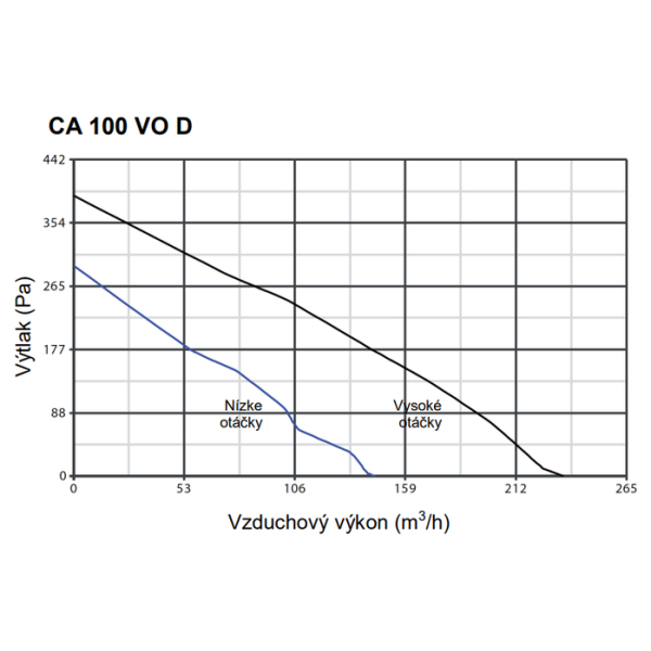 Radiálny potrubný ventilátor Vortice CA 100 V0 D s priemerom pripojenia vzduchotechnického potrubia ø 100 mm. Motor s tienenými pólmi má guľôčkové ložiská z nerez ocele. Ventilátor je určený na napojenie na kruhové potrubie a odsávanie komerčných i rezidenčných objektov a je vhodný na pripojenie do potrubia s vyššou tlakovou stratou, dosahuje vysokých vzduchových výkonov pri súčasnom dodržaní nízkej hlučnosti. (Dostupný tlak 366 Pa / Prietok vzduchu 251 m3/h).