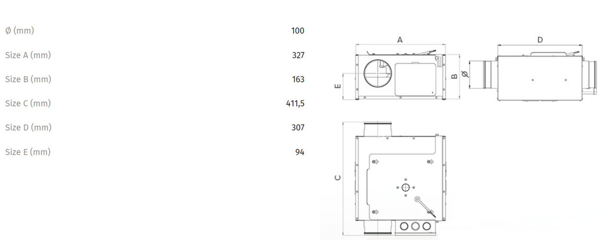 - EC motor ventilátora s vonkajším rotorom, hriadeľ otáčavý v guľôčkových ložiskách, spojený s dozadu zakriveným odstredivým obežným kolesom. Rýchlosť nastaviteľná pomocou potenciometra (signál 0-10V).