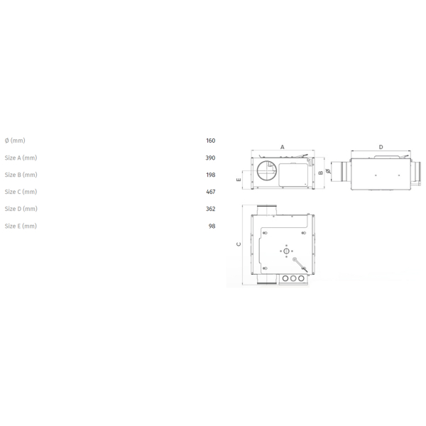 - Striedavý motorový ventilátor s externým rotorom, s hriadeľom otáčajúcim sa v guľôčkových ložiskách, spojený s dozadu zahnutým odstredivým obežným kolesom.