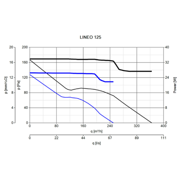 Dvojotáčkový potrubný ventilátor radu Lineo je vybavený AC motorom s 2-stupňovou reguláciou otáčok a guľôčkovými ložiskami. Typ T s časovým dobehom. Určený na pripojenie potrubia ø 125mm. Vďaka svojim vlastnostiam a konštrukcii je vhodný pre dlhšie vzduchotechnické potrubie. Krytie IP44 zaisťuje ochranu proti prachu a striekajúcej vode zo všetkých strán. Obežné koleso ventilátora je vyvážené priamo na motore.