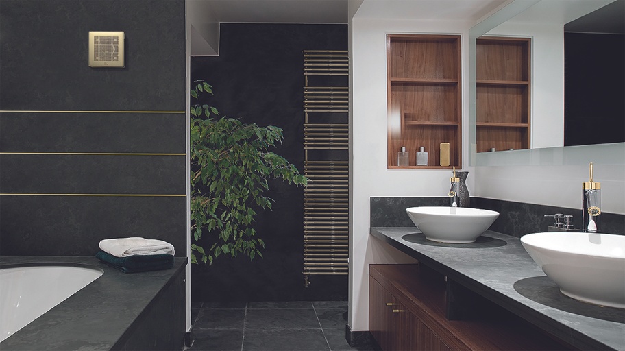 Veľmi tichý dizajnový axiálny ventilátor do kúpeľne s vysokým vzduchovým výkonom a vysokým krytím. Špeciálny dvojitý náter pomocou nanotechnológie v zlatej farbe YELLOW GOLD. Vhodné pre menšie a stredne veľké miestnosti s priamym výfukom alebo výfukom do krátkeho potrubia (ø100mm). Montáž na stenu alebo do stropu v akejkoľvek pozícii.