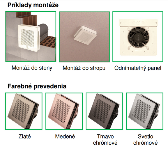 - Všetky modely majú krytie IP45, teda ochrana proti tryskajúcej vode, ktorá umožňuje ventilátor osadiť v kúpeľni aj do zóny 1.