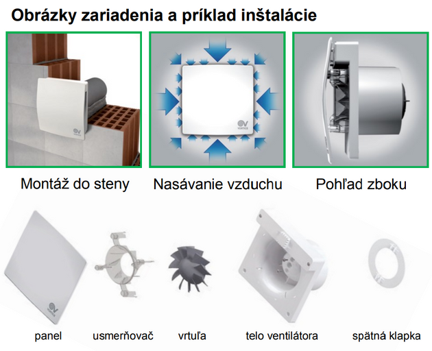 - Ventilátory s pripojením na potrubie ø120mm, s nastaviteľným 3-20 minútovým časovým spínačom s oneskoreným vypnutím. Ventilátor sa uvedie do činnosti spolu s osvetlením, ale zostane v činnosti aj po vypnutí svetla počas prednastaveného oneskoreného vypnutia.