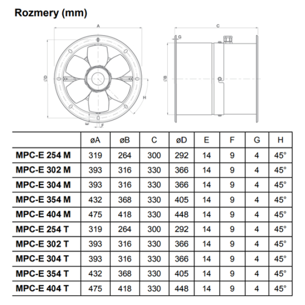 Jednofázový axiálny strednotlakový ventilátor Vorticel MPC-E s možnosťou napojenia na potrubie alebo s montážou do potrubia. Určený pre odvod vzduchu s maximálnou teplotou 70°C. Vhodný pre priemyselné a komerčné objekty (garáže, parkoviská, nemocnice, sklady, kancelárie, telocvične a iné) na odťah neprašného, neagresívneho a nekorozitvorného vzduchu bez kyselín. Profil lopatiek ventilátorov je navrhnutý tak, aby dosahovali nízku hladinu hluku.
