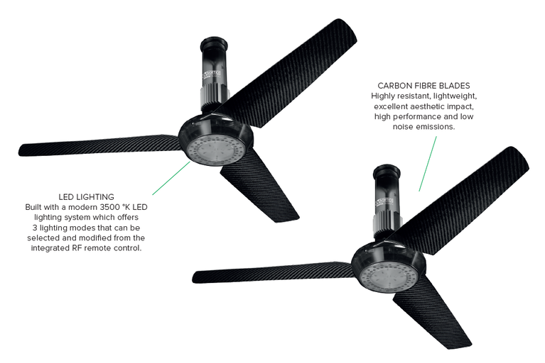 Luxusný stropný ventilátor Vortice NORDIK AIR DESIGN má lopatky z kvalitných uhlíkových vlákien, kryty motora a stropné tyče sú spolu s vekami zhotovené z titánovej termoplastickej živice. Ventilátor je dodávaný s LED osvetlením s tromi prevádzkovými režimami: domov, práce a zmiešané. Prepínať osvetlenie a upravovať jeho intenzitu je možné pomocou diaľkového ovládania, ktoré je súčasťou balenia. Ventilátor je vybavený motorom s guľôčkovými ložiskami. Ventilátor je zhotovený v titánovom prevedení.