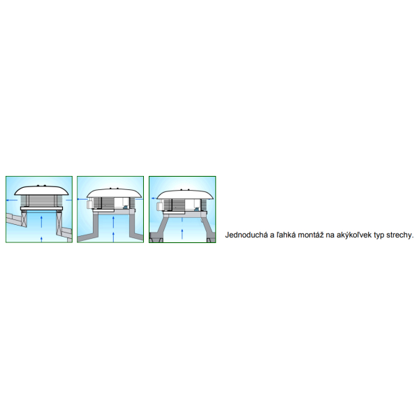 Nástrešný ventilátor Vortice Torrette s horizontálnym výfukom. Jednoduchá a ľahká montáž na akýkoľvek typ strechy obytných, komerčných a priemyselných budov. Ventilátor nie je vhodný pre odsávanie vzduchu priamo z krbu alebo kotlov.