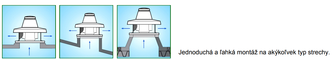 Nástrešný ventilátor Vortice Torrette s horizontálnym výfukom pre odsávanie horúcich vzdušnín. Nepretržitá prevádzka pri 90°C, 2-hodinová prevádzka pri 400°C. Jednoduchá a ľahká montáž na akýkoľvek typ strechy obytných, komerčných a priemyselných budov. Ventilátor nie je vhodný pre odsávanie vzduchu priamo z krbu alebo kotlov.