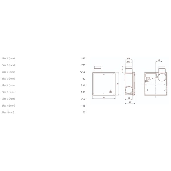 Vortice krabica QE-B I K90 S 2L – ako QE-B I K90 S + obsahuje doplnkové nerezové hrdlo na ľavej strane pre odsávanie z druhej miestnosti