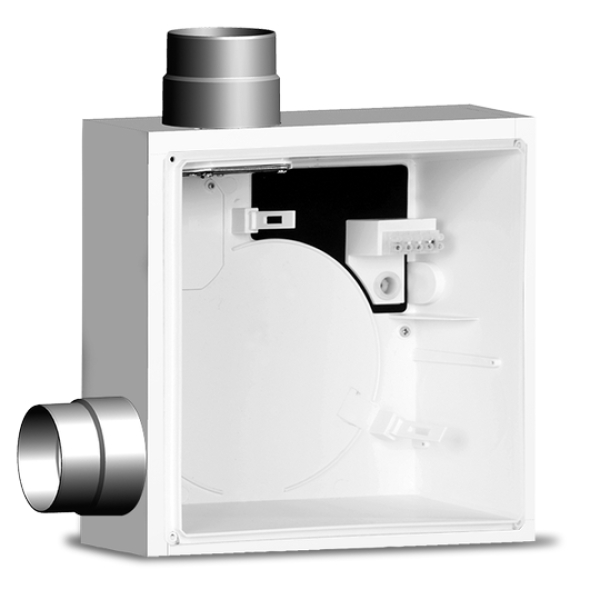 Krabica pre zapustenú montáž s požiarnou úpravou K90, s požiarnou spätnou klapkou K90 a bočným výfukom. Obsahuje doplnkové nerezové hrdlo na ľavej strane pre odsávanie z druhej miestnosti.