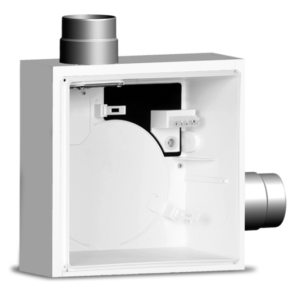 Krabica pre zapustenú montáž s požiarnou úpravou K90, s požiarnou spätnou klapkou K90 a bočným výfukom. Obsahuje doplnkové nerezové hrdlo na pravej strane pre odsávanie z druhej miestnosti.