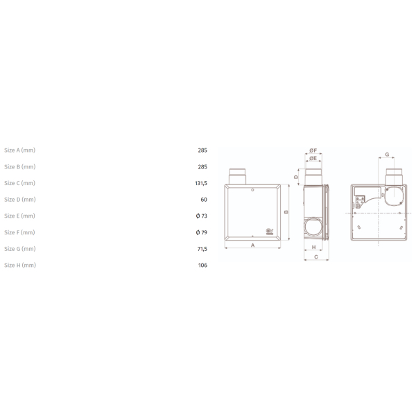 Vortice krabica QE-B I K90 S – krabica pre zapustenú montáž s požiarnou úpravou K90, s požiarnou spätnou klapkou K90 a bočným výfukom