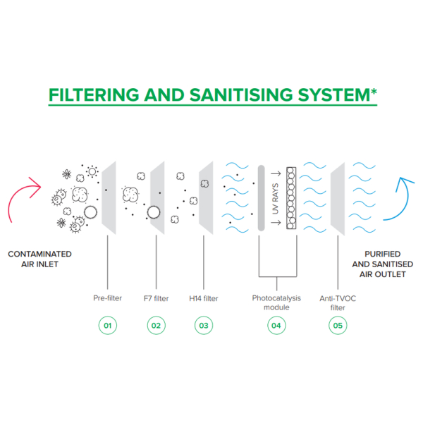 - Redukcia mikroorganizmov vo vzduchu, vďaka použitiu dvoch vysokoúčinných absolútnych filtrov HEPA H14, schopných zachytiť až do 99.995% mikročastíc (priemer 0.3 µm).