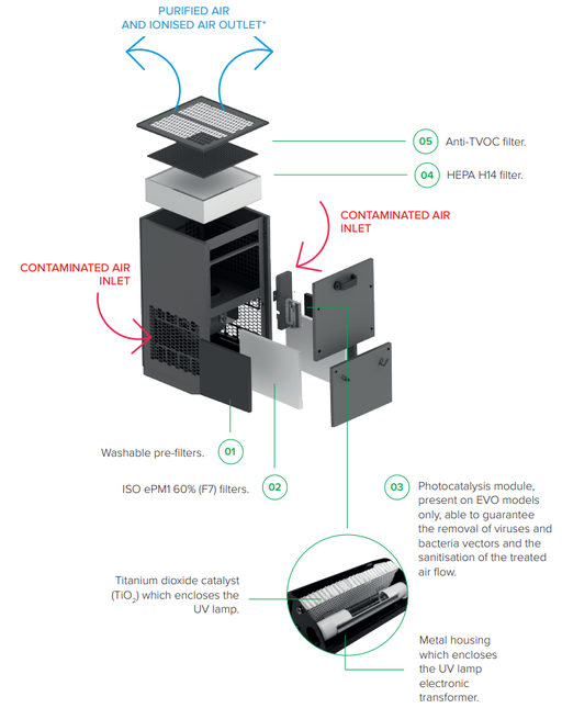 - ľahká výmena filtrov a fotokatalytického modulu (modely EVO), vďaka rýchlo odnímateľným panelom