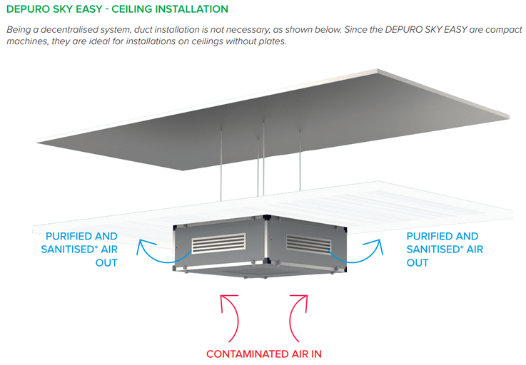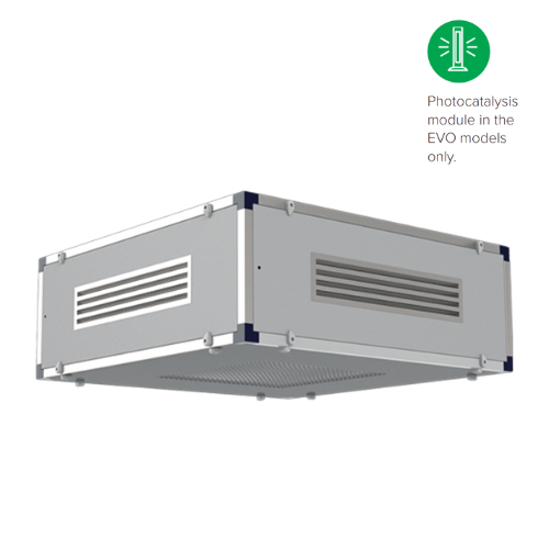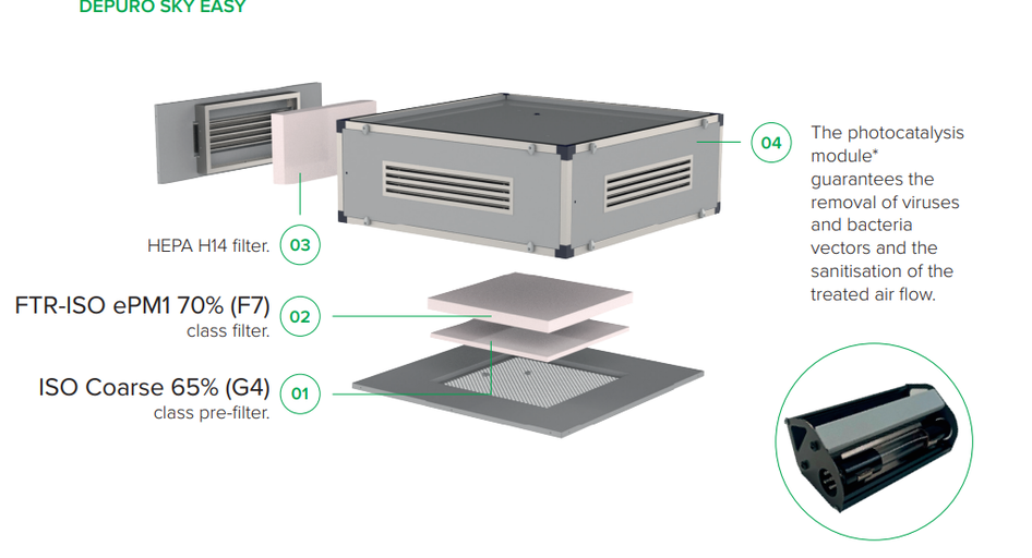 Vysokoúčinné čističe vzduchu Vortice Depuro Sky Easy Evo sú určené pre skrytú inštaláciu do stropu (podhľadu) v komerčných a priemyselných objektoch s plochou až 330 m2. Sú vysoko výkonné, jednoduché na inštaláciu a údržbu a tiché vďaka zvukotesným panelom. Vďaka komplexnému filtračnému systému dokážu rýchlo odstrániť koncentrácie znečisťujúcich látok, alergénov a patogénov prítomných vo vzduchu, čím zabezpečujú bezpečnosť a pohodlie obyvateľov. Efektívna ochrana aj proti vírusu COVID-19 vďaka fotokatalytickému modulu. Základom čistiaceho a dezinfekčného procesu je silne oxidačný účinok voľných radikálov OH*, ktoré sa uvoľňujú pri ožarovaní katalyzátora (na báze oxid u titaničitého (TiO2)) svetlom primeranej vlnovej dĺžky (UV-C lampa). Látky znečisťujúce ovzdušie ako oxid uhličitý (CO2), oxidy síry (SOx), oxidy dusíka (NOx), oxid uhoľnatý (CO) a polycyklické aromatické uhľovodíky (PAH) sa pomocou voľných radikálov OH* transformujú na zlúčeniny s výrazne nižšou úrovňou toxicity (napríklad oxid dusnatý (NO) a oxid dusičitý (NO2) sa transformujú na dusičnan (NO3)). Podobne v prípade prchavých organických zlúčenín (VOC), ako formaldehyd a acetón, ktoré patria medzi hlavné príčiny nepríjemného zápachu v uzavretom priestore, dochádza k ich rozkladu a transformácii na neškodné látky ako oxid uhličitý (CO2) a voda.