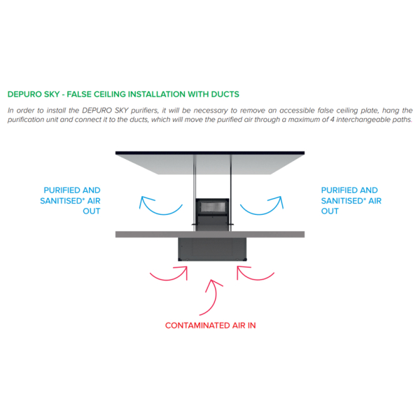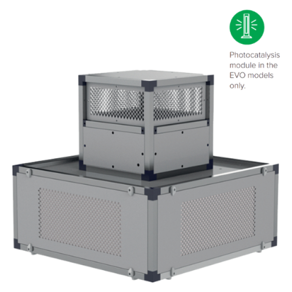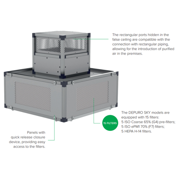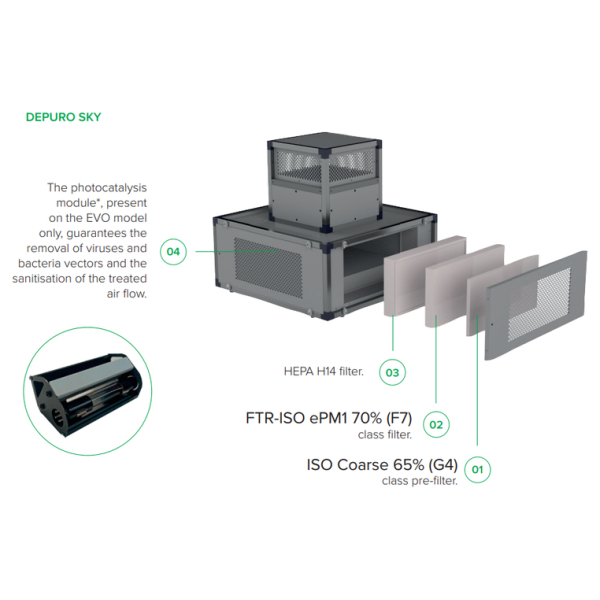 Vysokoúčinné čističe vzduchu Vortice Depuro Sky Evo sú určené pre skrytú inštaláciu do stropu (podhľadu) v komerčných a priemyselných objektoch s plochou až 330 m2. Sú vysoko výkonné, jednoduché na inštaláciu a údržbu a tiché vďaka zvukotesným panelom. Vďaka komplexnému filtračnému systému dokážu rýchlo odstrániť koncentrácie znečisťujúcich látok, alergénov a patogénov prítomných vo vzduchu, čím zabezpečujú bezpečnosť a pohodlie obyvateľov. Efektívna ochrana aj proti vírusu COVID-19 vďaka fotokatalytickému modulu. Základom čistiaceho a dezinfekčného procesu je silne oxidačný účinok voľných radikálov OH*, ktoré sa uvoľňujú pri ožarovaní katalyzátora (na báze oxid u titaničitého (TiO2)) svetlom primeranej vlnovej dĺžky (UV-C lampa). Látky znečisťujúce ovzdušie ako oxid uhličitý (CO2), oxidy síry (SOx), oxidy dusíka (NOx), oxid uhoľnatý (CO) a polycyklické aromatické uhľovodíky (PAH) sa pomocou voľných radikálov OH* transformujú na zlúčeniny s výrazne nižšou úrovňou toxicity (napríklad oxid dusnatý (NO) a oxid dusičitý (NO2) sa transformujú na dusičnan (NO3)). Podobne v prípade prchavých organických zlúčenín (VOC), ako formaldehyd a acetón, ktoré patria medzi hlavné príčiny nepríjemného zápachu v uzavretom priestore, dochádza k ich rozkladu a transformácii na neškodné látky ako oxid uhličitý (CO2) a voda.